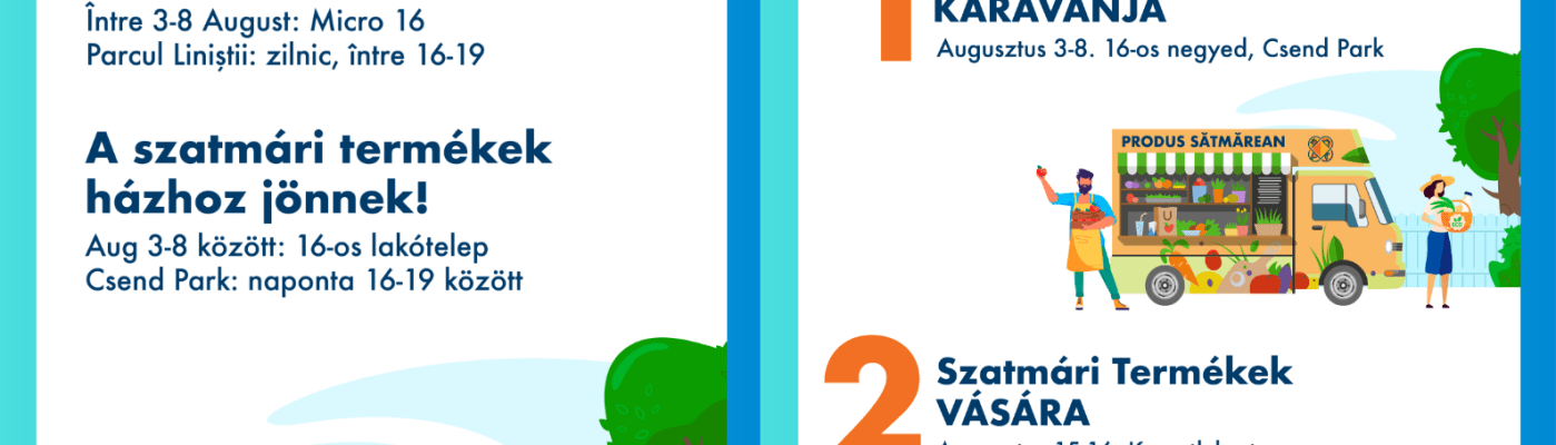 Közelebb visszük a helyi terméket a fogyasztókhoz: augusztus 3-8. között a 16-os lakónegyedbe érkezik a Szatmári Termék védjeggyel feliratozott mikrobusz, a helyi termelőkkel naponta 16-19 óra között lehet találkozni a Csend Parkban. Következő héten a 17-es lakónegyedbe, az UFO Park mellé érkezik a karaván.