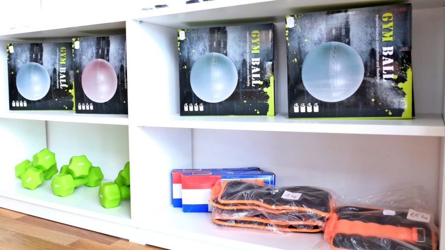 Súlyzók is találhatók náluk. Ezek Magyarországon gyártott, elsősorban otthoni felhasználásra szánt nehezékek. „Azokra gondoltunk ezekkel az eszközökkel is, akiknek nem nagyon van idejük fitnesztermekbe járni edzésre, ellenben ügyelni kívánnak a kondíciójukra, nos, ők ezekkel is tehetnek a fittségükért” – magyarázza az eladó, cégvezető. Gál Karola hozzáteszi: számos erősítő szalagjuk van, gyógylabdájuk, sportkesztyűket is találunk náluk.