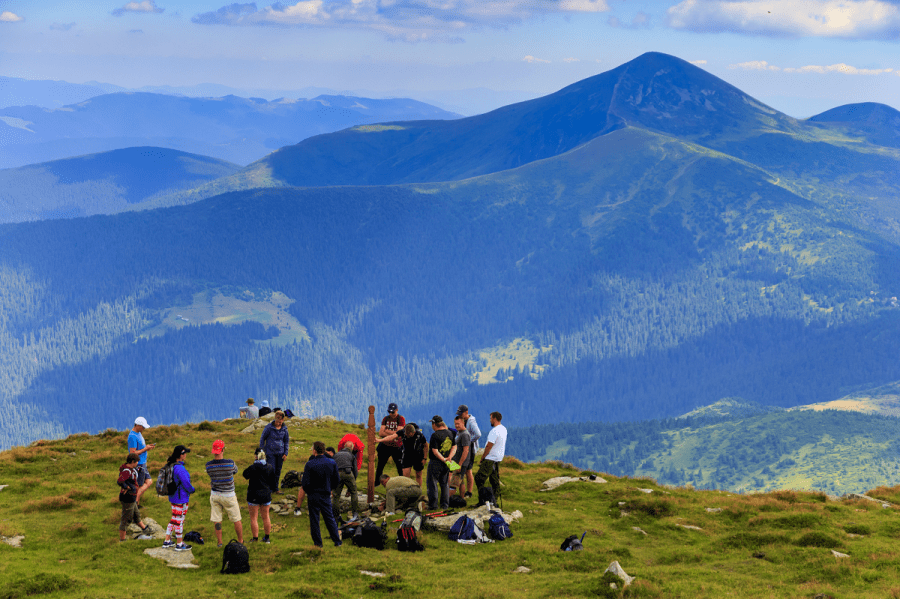 Kopjafát állítanak a csúcs megmászása alkalmából a Kárpátaljai Hazajáró Honismereti és Turista Egylet tagjai a 2020 méter magas kárpátaljai Kőhavason (Petros-csúcs) 2020. augusztus 22-én. A háttérben az Ukrán-Kárpátok, egyben Ukrajna legmagasabb hegycsúcsa, a 2061 méter magas Hóvár (Hoverla) látható.