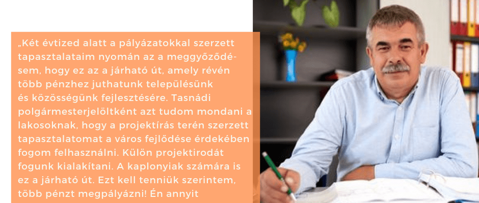 „Két évtized alatt a pályázatokkal szerzett tapasztalataim nyomán az a meggyőződésem, hogy ez az a járható út, amely révén több pénzhez juthatunk településünk és közösségünk fejlesztésére. Tasnádi polgármesterjelöltként azt tudom mondani a lakosoknak, hogy a projektírás terén szerzett tapasztalatomat a város fejlődése érdekében fogom felhasználni. Külön projektirodát fogunk kialakítani. A kaplonyiak számára is ez a járható út. Ezt kell tenniük szerintem, több pénzt megpályázni! Én annyit mondhatok, hogy Megyeri Tamással kifejezetten jó lenne az együttműködésünk. Hajrá, Tasnád, hajrá, Kaplony, hajrá, Szatmár megye!”
