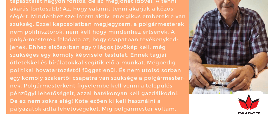 „Egész egyszerűen senki nem születik polgármesternek. A tapasztalat nagyon fontos, de az megjöhet idővel. A tenni akarás fontosabb! Az, hogy valamit tenni akarjak a közösségért. Mindehhez szerintem aktív, energikus emberekre van szükség.