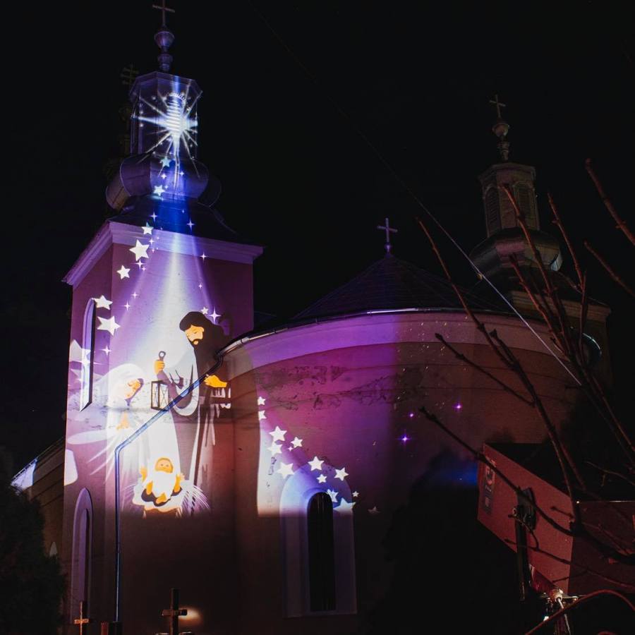 Szatmárnémeti szakemberek az alkalomhoz illő képeket vetítenek a templom falára.