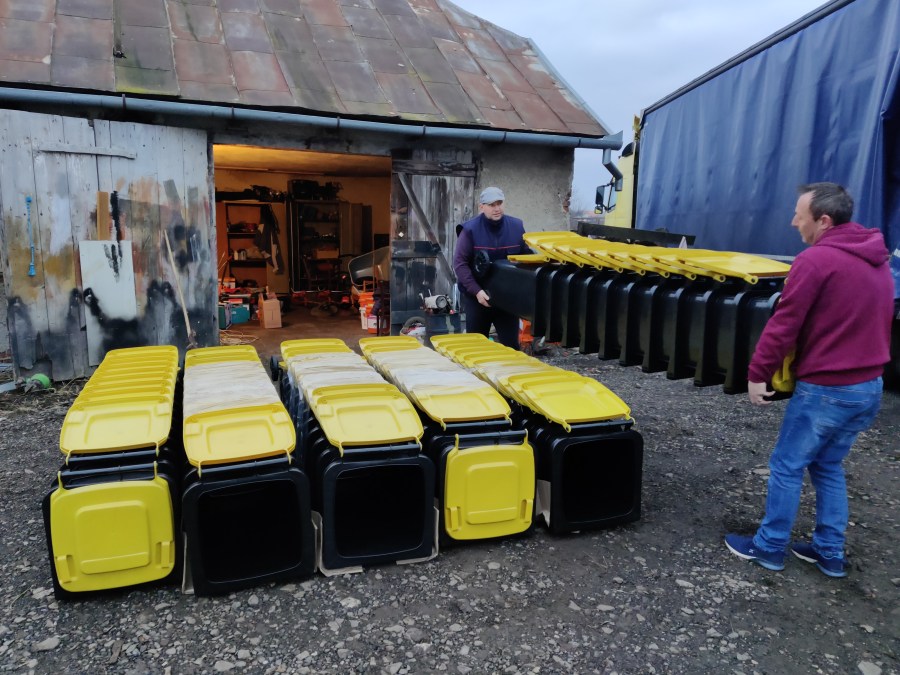 Már éjjel megérkeztek Kaplonyba a Csíkszeredából megrendelt szemetestartályok. Reggel hozzá is kezdtek a teherautó lepakolásához.