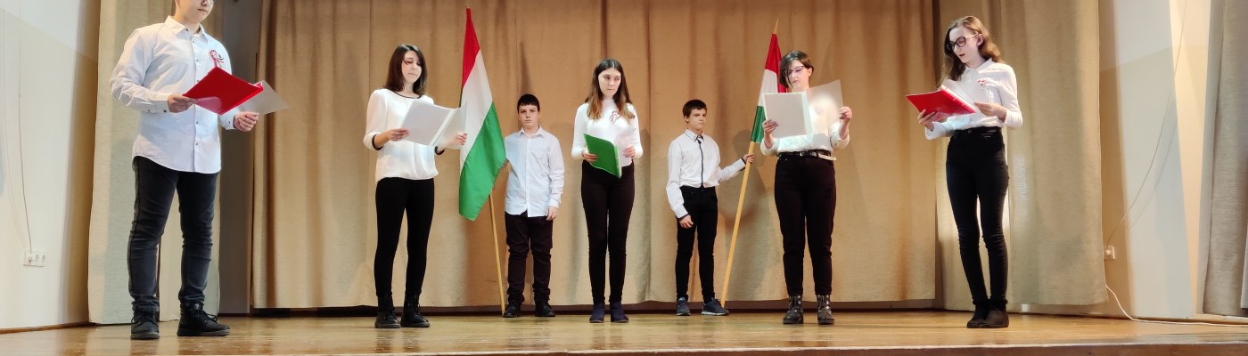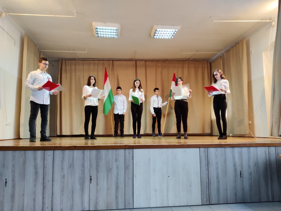 A Fényi István Általános Iskola 5-8. osztályos diákjait, Tímár Asztrik OFM plébánost és Erdős Csaba tiszteletest, valamint a hivatalnokokat Török Tamás iskolaigazgató köszöntötte a kultúrházban otthonra lelt ünnepi műsor nyitányaként. A 173 éve történtek jelentőségét emelte ki a hallgatóságának a történész végzettségű pedagógus. A továbbiakban hetedik osztályos diákok alkalomhoz illő, a mai fiatalokhoz is szóló műsor-összeállítással kedveskedtek, ezt Lászlóffy Csaba Zsolt magyar szakos tanár állította össze, és ő is készítette fel az amúgy módfelett ügyes tanulókat.