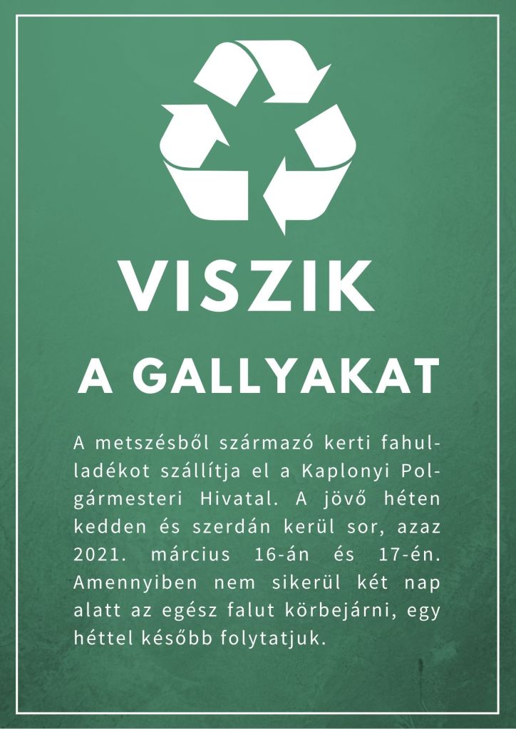 A metszésből származó kerti fahulladék elszállítására vállalkozik a Kaplonyi Polgármesteri Hivatal. Ezzel igyekeznek a lakosok segítségére sietni. Minderre a héten kedden és szerdán, azaz holnap és holnapután kerül sor, azaz 2021. március 16-án és 17-én. Amennyiben nem sikerül két nap alatt az egész falut körbejárni, egy héttel később fogják folytatni.