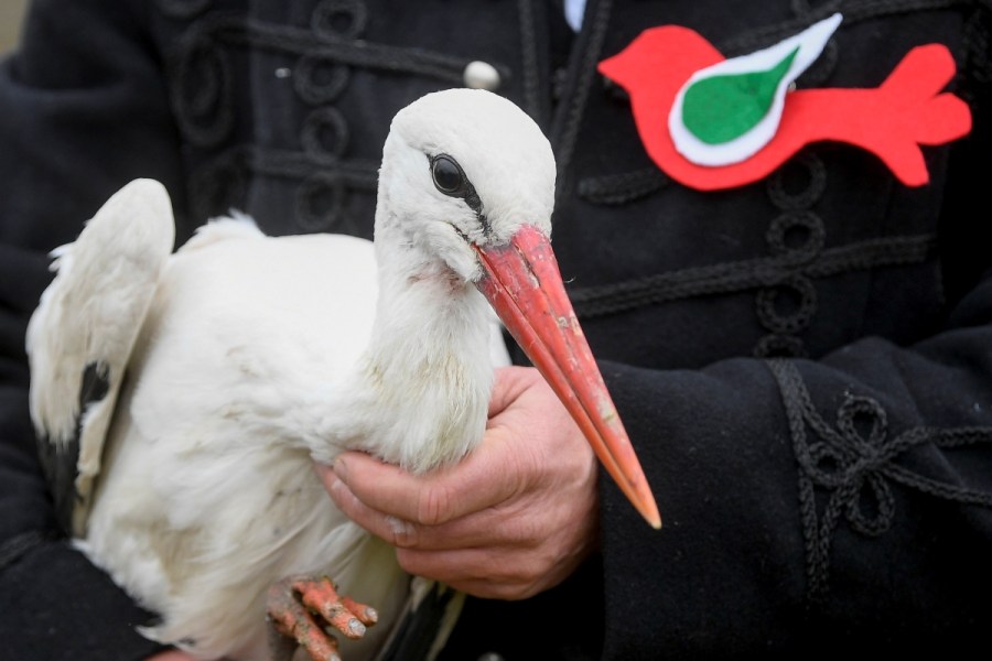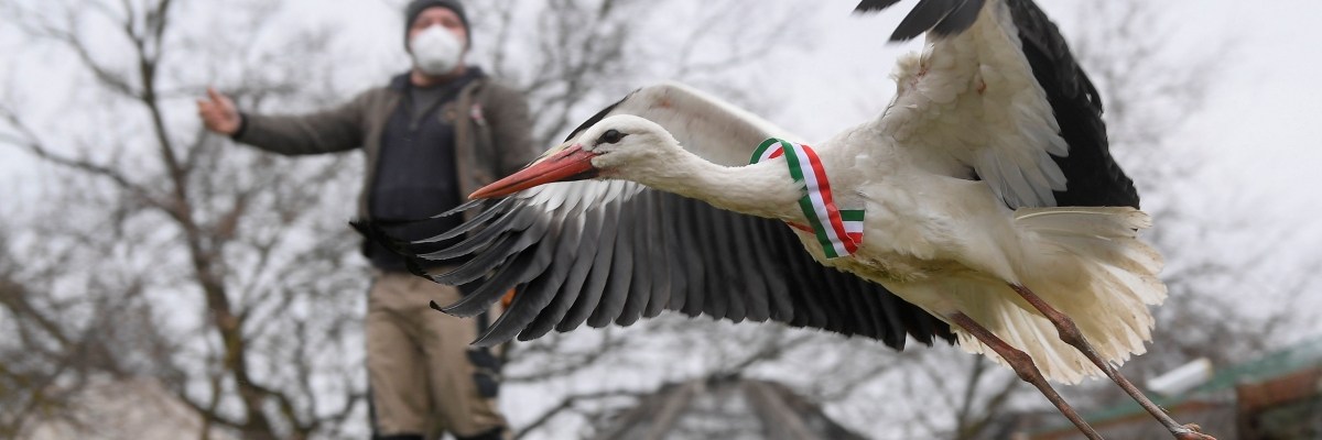 Sérülésből felépült, könnyen leváló nemzeti színű szalaggal is megjelölt gólyát enged szabadon a Hortobágyi Madárpark egyik munkatársa 2021. március 15-én.