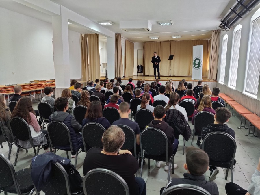 A humor játék. Marosán Csaba kolozsvári színművész tartott ma előadást a kaplonyi iskolásoknak a kultúrotthonban.