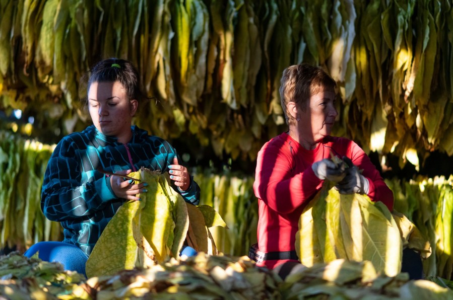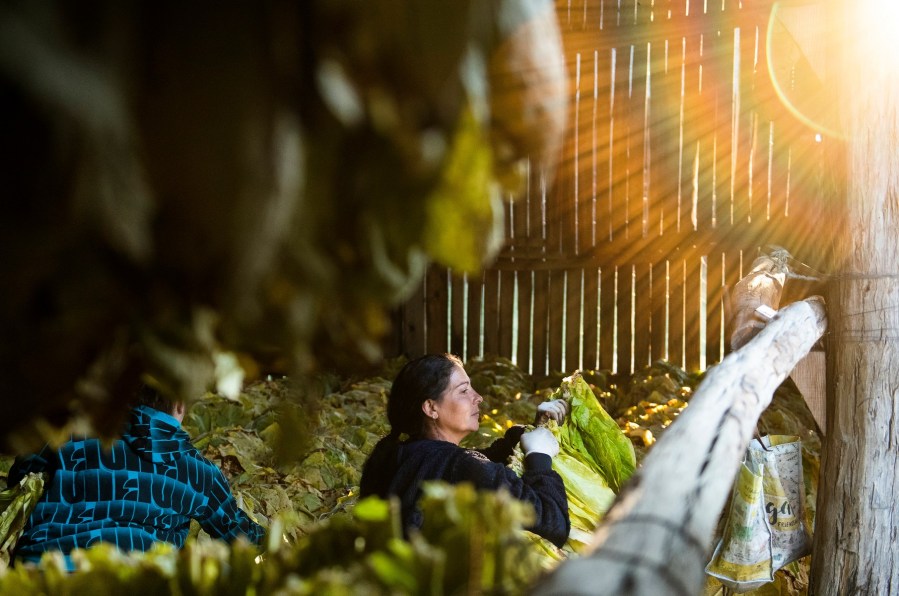Mezőgazdasági dolgozó töri a dohányt egy Burley típusú dohányt termelő mezőgazdasági vállalkozó földjén a Szabolcs-Szatmár-Bereg megyei Biriben 2021. szeptember 13-án.