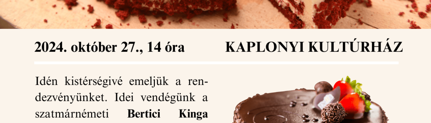 Ebben az évben is megtartjuk a kaplonyi tortaversenyt. Mégpedig az október 27-ei vasárnapon. Idén a vendégünk, a főítész a szatmárnémeti Bertici Kinga mestercukrász lesz.