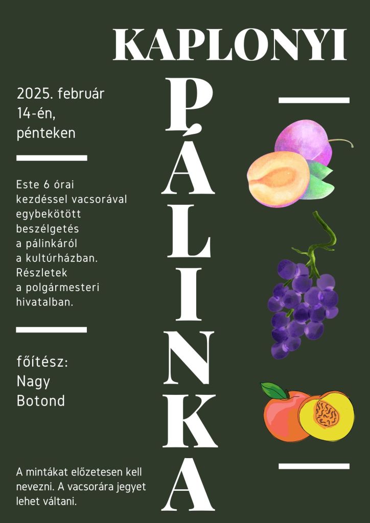 Már lehet jelentkezni az idei pálinkaversenyre! Mint ismeretes, Kaplonyban évente a pálinka készítéséről, fogyasztásáról szóló estet tartanak. Erre a 2025-ös esztendőben február 14-én, pénteken 18 órai kezdéssel a kultúrotthonban kerül sor. Minden helybeli és vidékbeli pálinkatisztelőt szeretettel várnak!