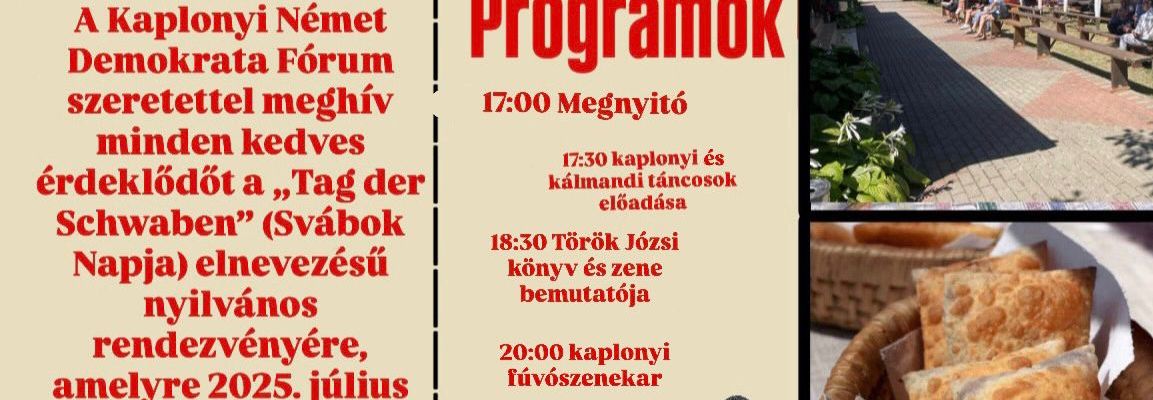 „Szeretettel meghívunk minden kedves érdeklődőt a „Tag der Schwaben” – azaz a Svábok Napja – ünnepségre, amelyre 2025. július 26-án, szombaton kerül sor a Kaplonyi Német Demokrata Fórum székházában.