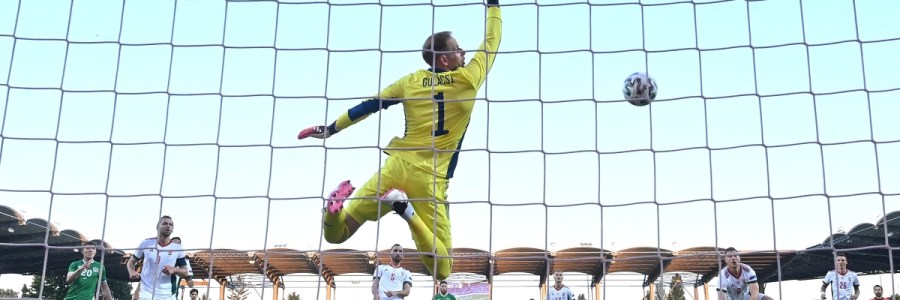 Gulácsi Péter magyar kapus véd a Magyarország–Írország barátságos labdarúgó-mérkőzésen Budapesten, a Szusza Ferenc Stadionban 2021. június 8-án.