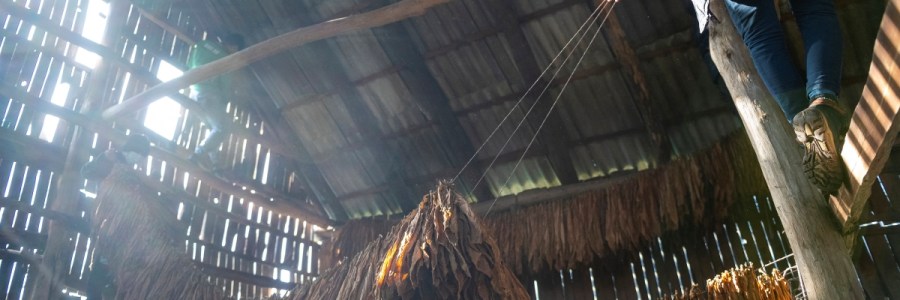 Levegőn szárított dohányleveleket szednek le a szárítópajta zsinórjáról egy dohánytermesztéssel foglalkozó család tagjai a Szabolcs-Szatmár-Bereg megyei Biriben 2021. január 27-én.