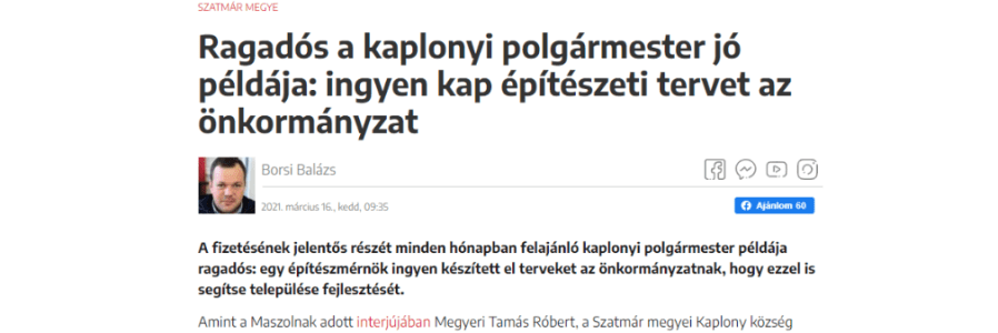 Az országos sajtó is megemlítésre méltónak tartja ifj. Kind László mérnökember nagylelkűségét. Mint beszámoltunk róla, műhely-, illetve garázsépület építése vált elodázhatatlanná Kaplony községben. Ebben az épületben lelne otthonra a község katasztrófaelhárító-csapata is.