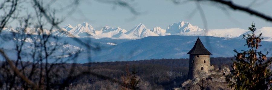 A Magas-Tátra látszik a somoskői vár mögött Salgótarján közeléből fotózva 2021. február 1-jén.